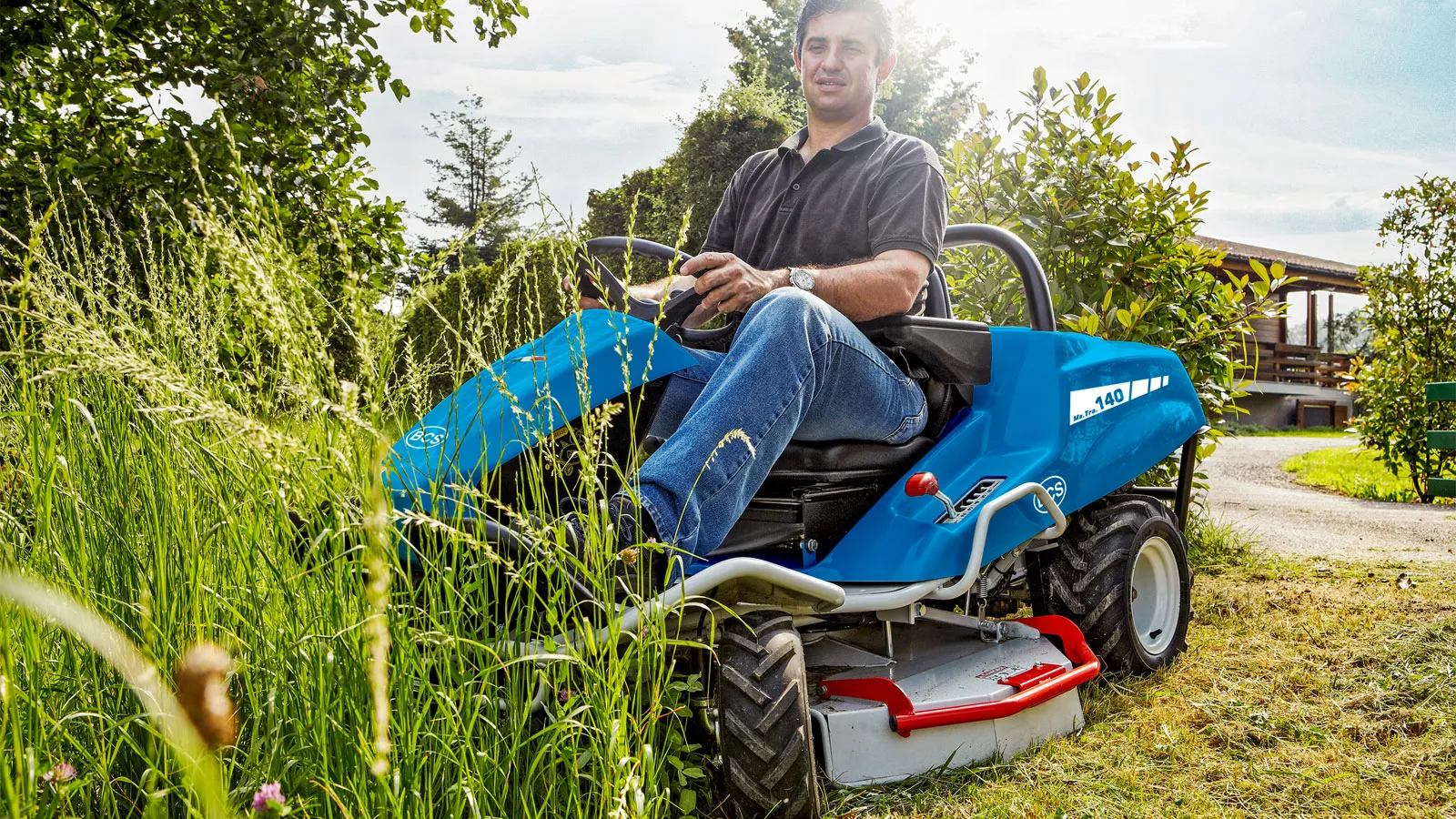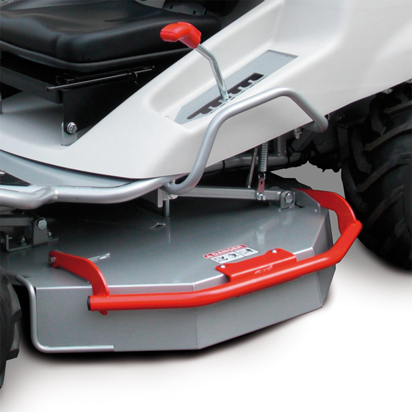 Режущая дека. 85-сантиметровая однолопастная косильная дека повышенной мощности с задним выбросом позволяет скашивать и измельчать большое количество травы и древесных кустарников. Режущий агрегат приводится в действие кнопкой, расположенной рядом с рулевым колесом. Высота резки регулируется в 6 положениях с сиденья оператора, а поднимающиеся боковые защитные створки облегчают очистку после работы и техническое обслуживание.